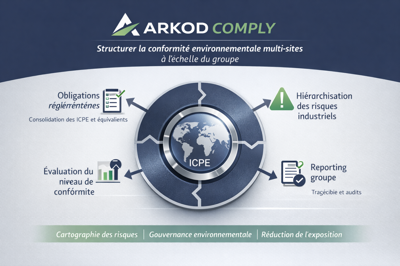 ARKOD COMPLY permet de structurer et piloter la conformité réglementaire environnementale à l’échelle de l’organisation, en transformant un système fragmenté en dispositif consolidé, maîtrisé et auditable.